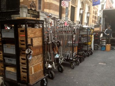 - Narrow Muscle Cart. This unit measures 25" wide from fender to fender, to squeeze between those tight spots on location or in the van/truck. The bottom and sides are fabricated with perforated steel, to give a wet sandbag a chance to drain out from the inevitable east coast weather. Our unique braking system keeps this cart where you want it.